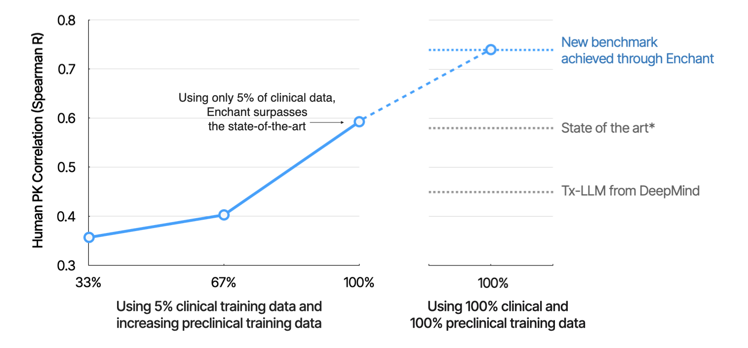 Last year, we introduced Enchant, a multimodal transformer model that redefined drug discovery prediction in low-data regimes. Enchant is trained on many data modalities from dozens of external and internal sources, across chemical, biological, preclinical, clinical, and other contexts. The ability to make high-confidence predictions in low-data regimes is of particular importance to drug discovery, where the capacity to generate data at scale is limited to the earliest stages of the discovery process.